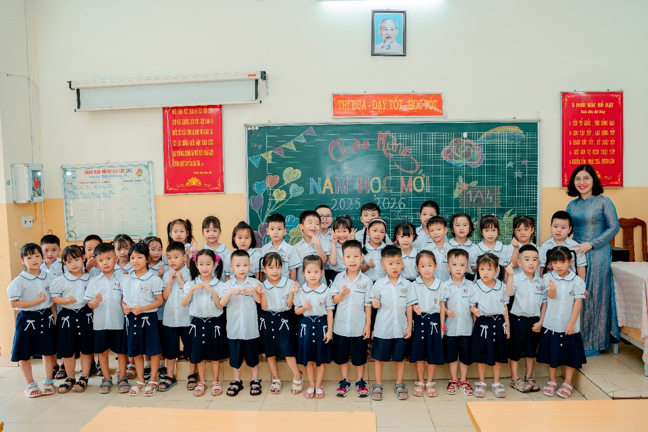 Sáng 5/9, sân trường rộn ràng tiếng cười nói, cờ hoa rực rỡ chào đón ngày khai giảng. Các bạn nhỏ lớp 1A4 trong bộ đồng phục mới tinh, gương mặt háo hức bước vào cổng trường. Cô giáo chủ nhiệm nở nụ cười hiền, dang rộng vòng tay chào đón học trò bước vào năm học mới.