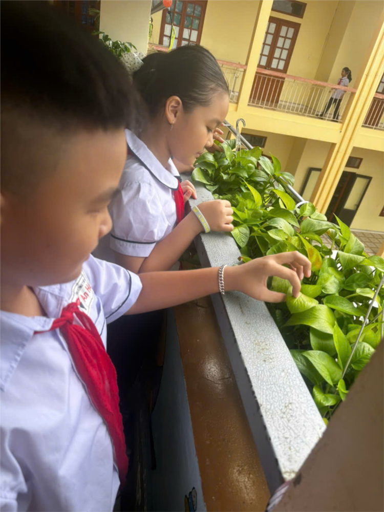 Mỗi tuần, vào giờ sinh hoạt cuối tuần, các bạn học sinh lớp 4A3 lại cùng nhau tưới cây, nhổ cỏ và cắt tỉa những lá vàng úa. Các em còn phân công nhau chăm sóc từng chậu cây nhỏ, đặt tên cho cây và theo dõi sự phát triển của chúng. Điều đặc biệt là các bạn còn tận dụng chai nhựa tái chế làm chậu cây, vừa tiết kiệm vừa bảo vệ môi trường.