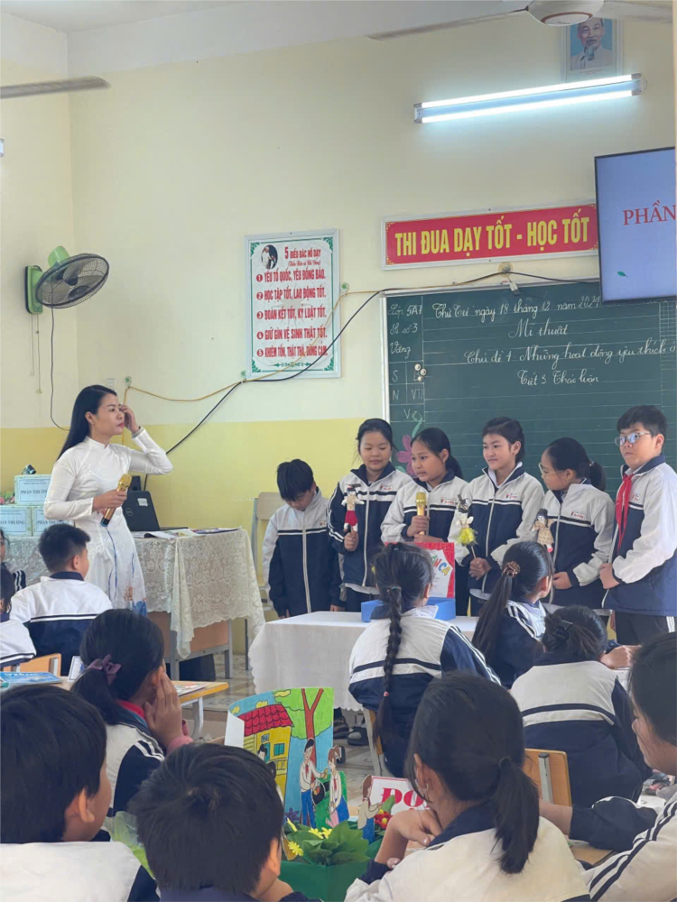 Môn học được lựa chọn lên lớp chuyên đề là môn Mĩ thuật lớp 5: Chủ đề 4: Những hoạt động yêu thích ở trường em (tiết 3). Thực hiện lên lớp là cô giáo Trần Thị Trang. Sau phần dự giờ tiết học là phần thảo luận, chia sẻ. Các ý kiến đều đi đến thống nhất đó là: GV ứng dụng linh hoạt công nghệ thông tin vào giảng dạy. Lựa chọn phương pháp tích hợp phù hợp với từng môn học, mỗi môn học có cách tích hợp riêng. Sử dụng phương pháp tích cực tạo các hoạt động thực hành và trải nghiệm như đóng vai, trò chơi giáo dục, thảo luận nhóm. Sử dụng công cụ công nghệ như video, hình ảnh minh họa, các ứng dụng học tập để học sinh hiểu rõ hơn. Xác định mục tiêu tích hợp, hiểu rõ kỹ năng công dân số để gắn những kỹ năng này với mục tiêu học tập của từng môn học. Tích hợp qua các tình huống thực tế gần gũi, như cách sử dụng thiết bị công nghệ an toàn, tìm kiếm thông tin đúng cách. Xây dựng kỹ năng cơ bản về công dân số An toàn trực tuyến: Hướng dẫn học sinh cách bảo vệ thông tin cá nhân và tránh các mối nguy hại trên internet. Dạy học sinh hiểu việc tôn trọng bản quyền, không sao chép hay chia sẻ nội dung trái phép. Kỹ năng sử dụng công nghệ: Hướng dẫn các thao tác cơ bản như tìm kiếm thông tin, gửi email hoặc sử dụng các ứng dụng học tập. Phối hợp với phụ huynh hướng dẫn phụ huynh cùng tham gia vào việc giáo dục học sinh về công dân số, như quản lý thời gian sử dụng thiết bị, cùng thảo luận các vấn đề khi cần thiết.