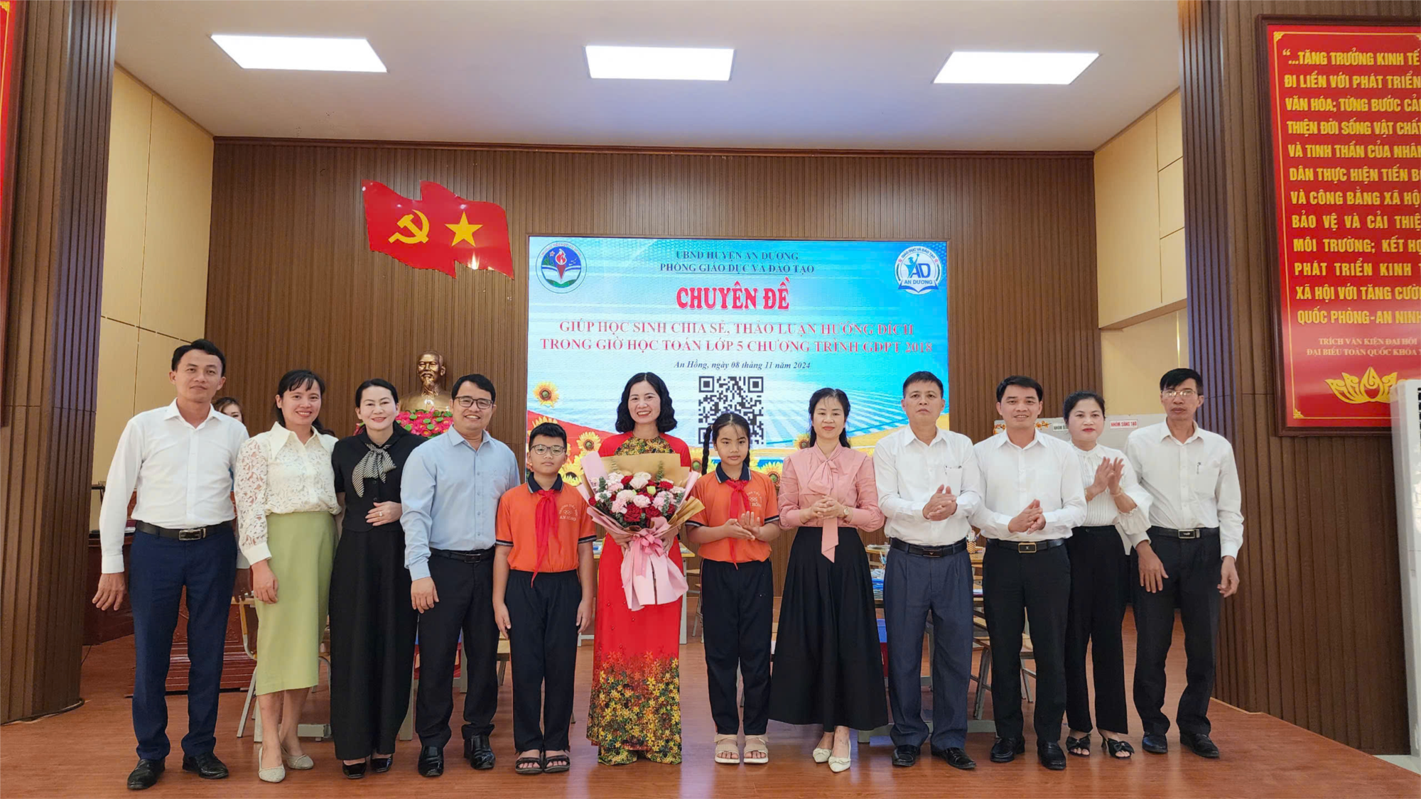 Tại chương trình, đại diện lãnh đạo trường Tiểu học An Hồng cho biết, Chuyên đề chuyên môn cấp huyện “Giúp học sinh chia sẻ, thảo luận hướng đích trong giờ học Toán lớp 5 chương trình GDPT 2018” được tổ chức nhằm vận dụng sáng tạo, linh hoạt các hình thức tổ chức dạy học, ứng dụng công nghệ thông tin theo hướng đổi mới, ứng dụng chuyển đổi số giúp cho giờ học sinh động, phong phú, lôi cuốn học sinh.