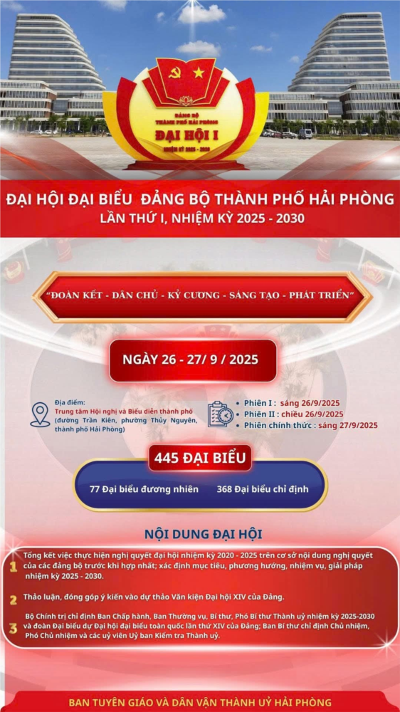 Đại hội đại biểu Đảng bộ thành phố Hải Phòng lần thứ I, nhiệm kỳ 2025 - 2030 diễn ra trong 2 ngày, từ ngày 26 - 27/9/2025. Đại hội có 02 nhiệm vụ: