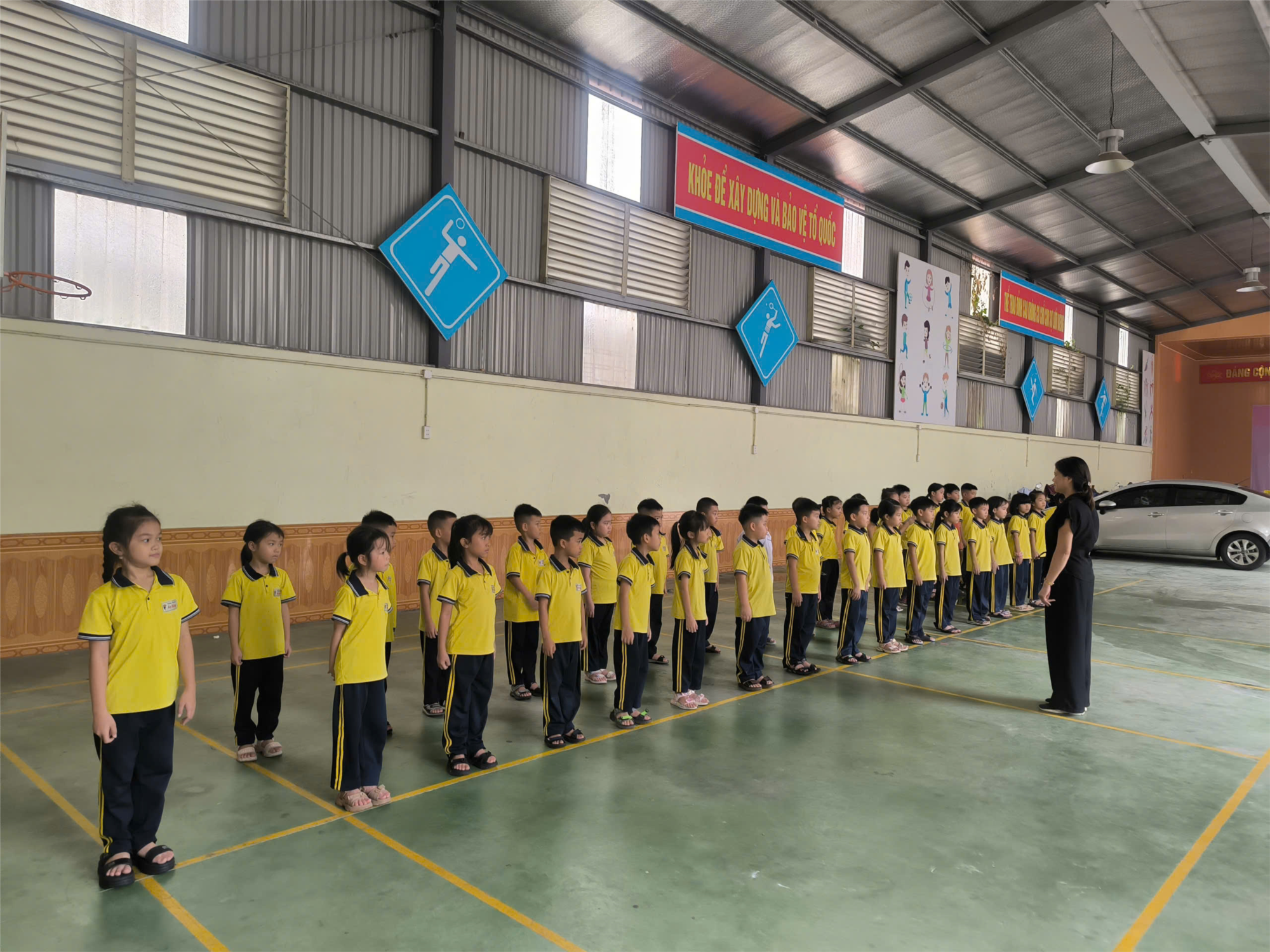 Mở đầu tiết học, cô giáo Đặng Thị Hân tập hợp, điểm số học sinh theo đội hình hàng ngang. Sau đó là phần khởi động các động tác xoay khớp cổ tay, cánh tay, khớp gối ,.....