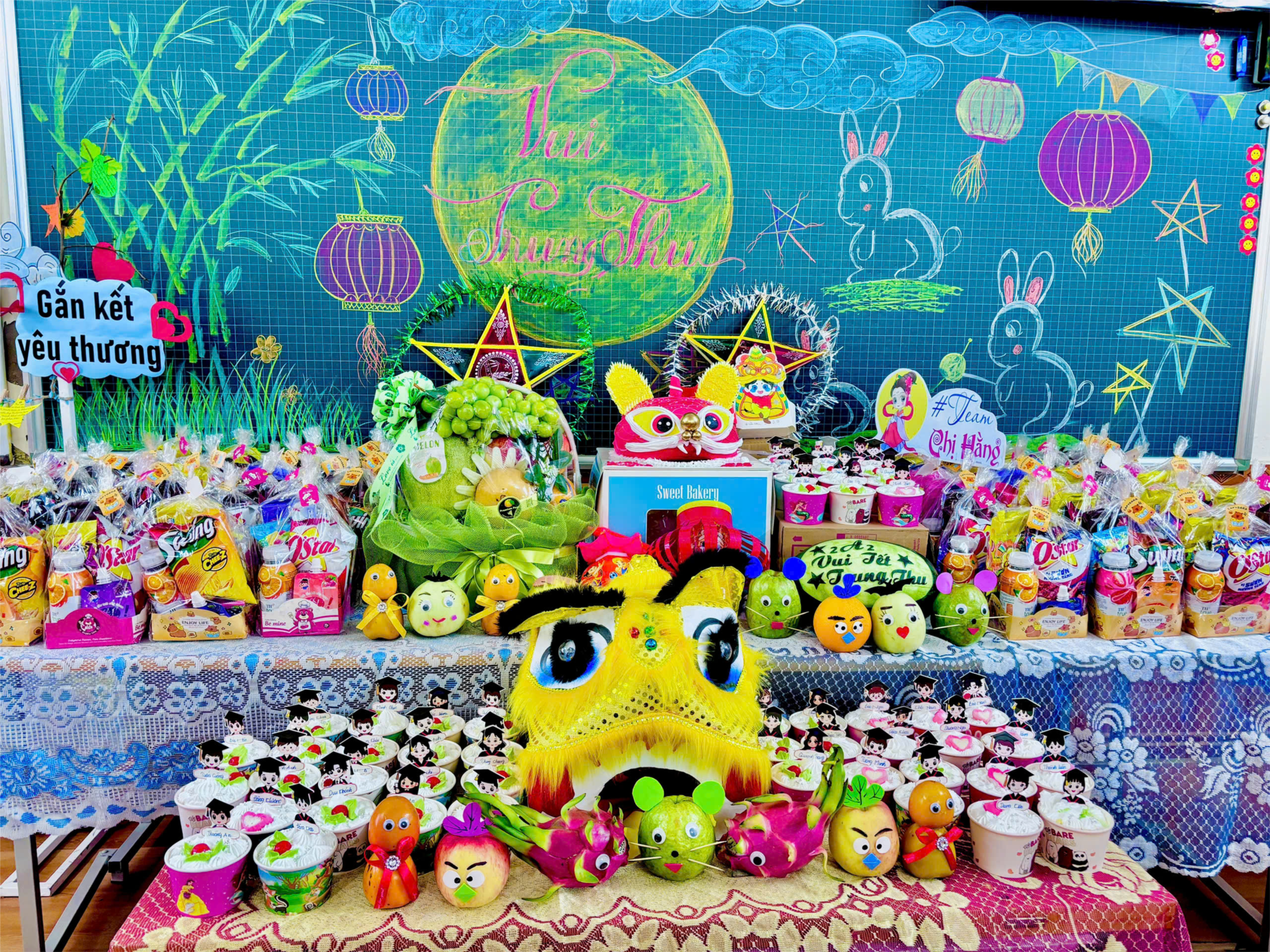🎏 Ngay từ sáng, các con đã háo hức mang đến những chiếc đèn lồng, bánh kẹo và trái cây để cùng trang trí lớp học. Lớp học bỗng trở nên lung linh với những dây đèn nhiều màu, những chiếc mặt nạ ngộ nghĩnh và mâm cỗ Trung thu đầy ắp. Khi tiếng trống lân vang lên, ánh mắt của các con sáng lên niềm vui và háo hức.