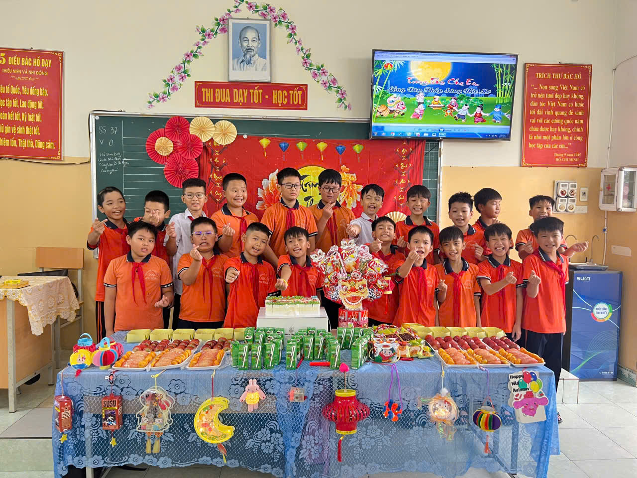 Chương trình được chuẩn bị chu đáo dưới sự hướng dẫn của cô giáo chủ nhiệm và sự phối hợp nhiệt tình từ Ban phụ huynh lớp. Mở đầu là các tiết mục văn nghệ đặc sắc do chính các bạn học sinh biểu diễn như hát tập thể “Chiếc đèn ông sao”, hát “Thằng cuội”, “Rước đèn tháng Tám”; trò chơi đố vui do quản trò Xuân Hiếu, biểu diễn đàn piano của Thái Bảo… mang đến không khí rộn ràng, tươi vui đúng tinh thần ngày hội. Phần được mong chờ nhất chính là màn múa lân sôi động, rực rỡ sắc màu. Tiếng trống lân vang lên giòn giã khiến cả sân trường như bừng sáng, thu hút không chỉ học sinh lớp 5A7 mà cả các bạn lớp khác và thầy cô cũng hào hứng theo dõi. Kết thúc chương trình là màn phá cỗ Trung thu – một hoạt động truyền thống không thể thiếu. Bàn cỗ được chuẩn bị đẹp mắt với mâm ngũ quả, bánh nướng, bánh dẻo cùng nhiều loại bánh kẹo, hoa quả. Các em cùng nhau quây quần bên mâm cỗ, chia sẻ niềm vui, thể hiện tinh thần đoàn kết, yêu thương.