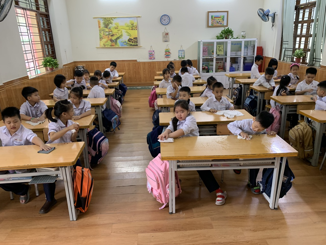 Các em học sinh tự giác lau bàn ghế, chỗ ngồi của mình vào